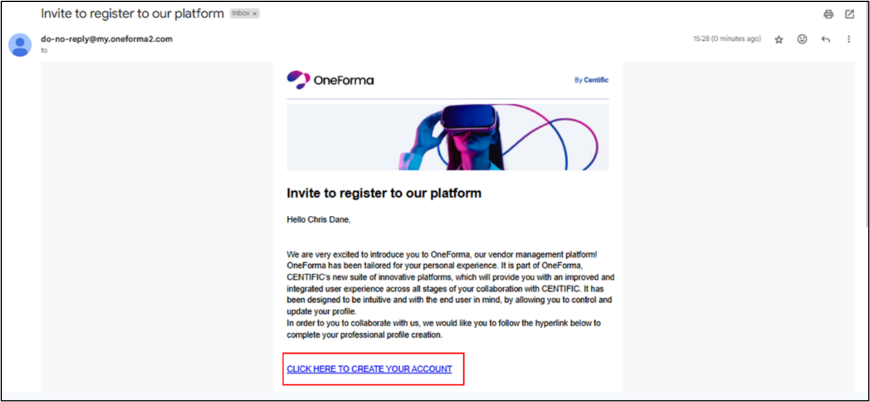 - Open your email inbox and locate the invitation email to register with OneForma.