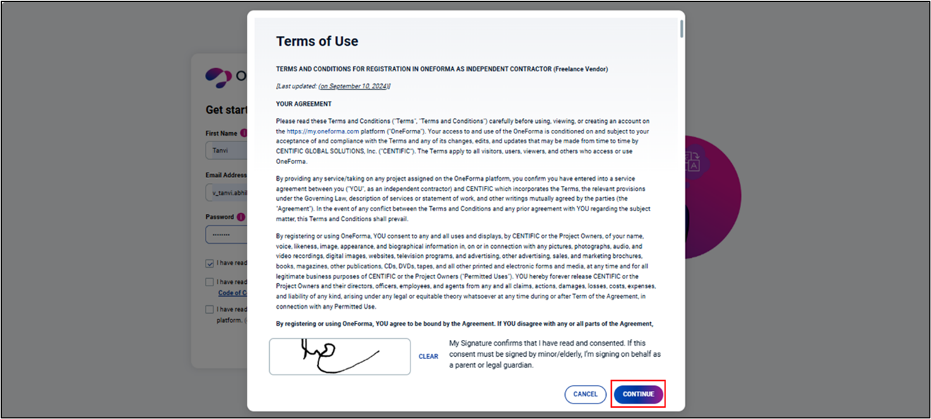 the OneForma pages“, read through the Terms of Use conditions, scroll to the