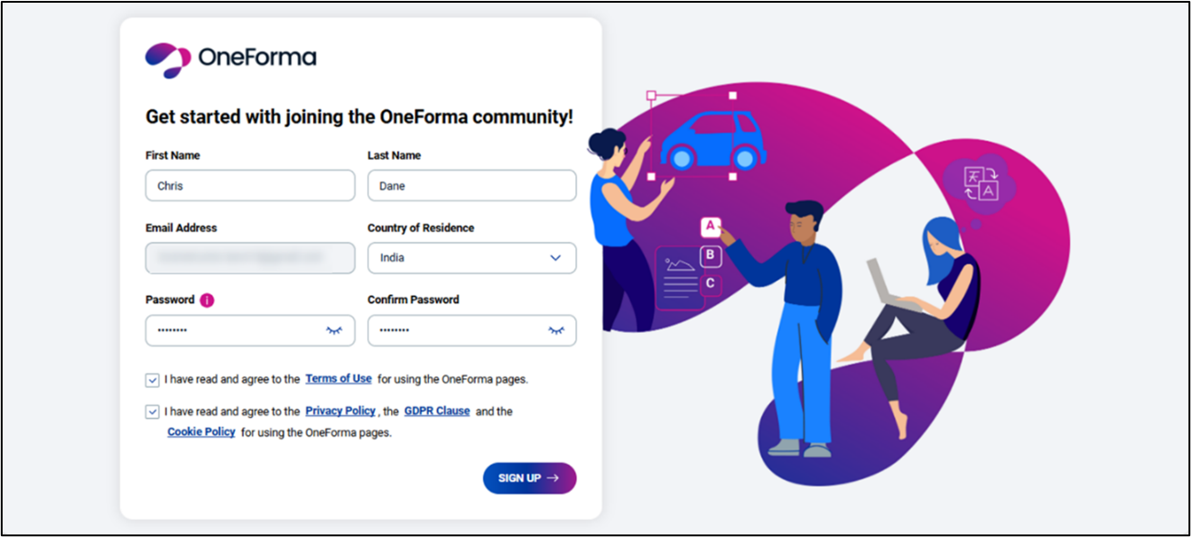 - Select the checkbox labeled “I have read and agree to the Privacy Policy, the GDPR Clause, and the Cookie Policy for using the OneForma pages“, after reading through it carefully.