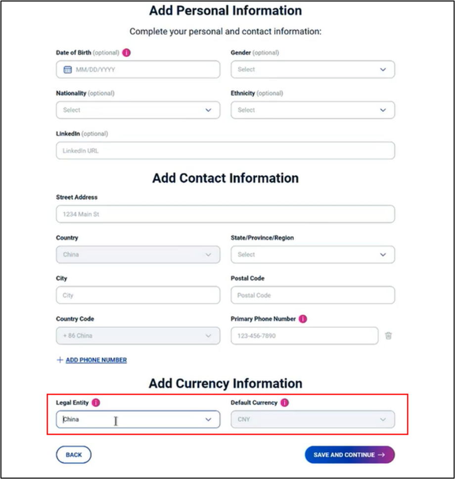 - If your country of residence is not China, Legal Entity field will not be displayed.