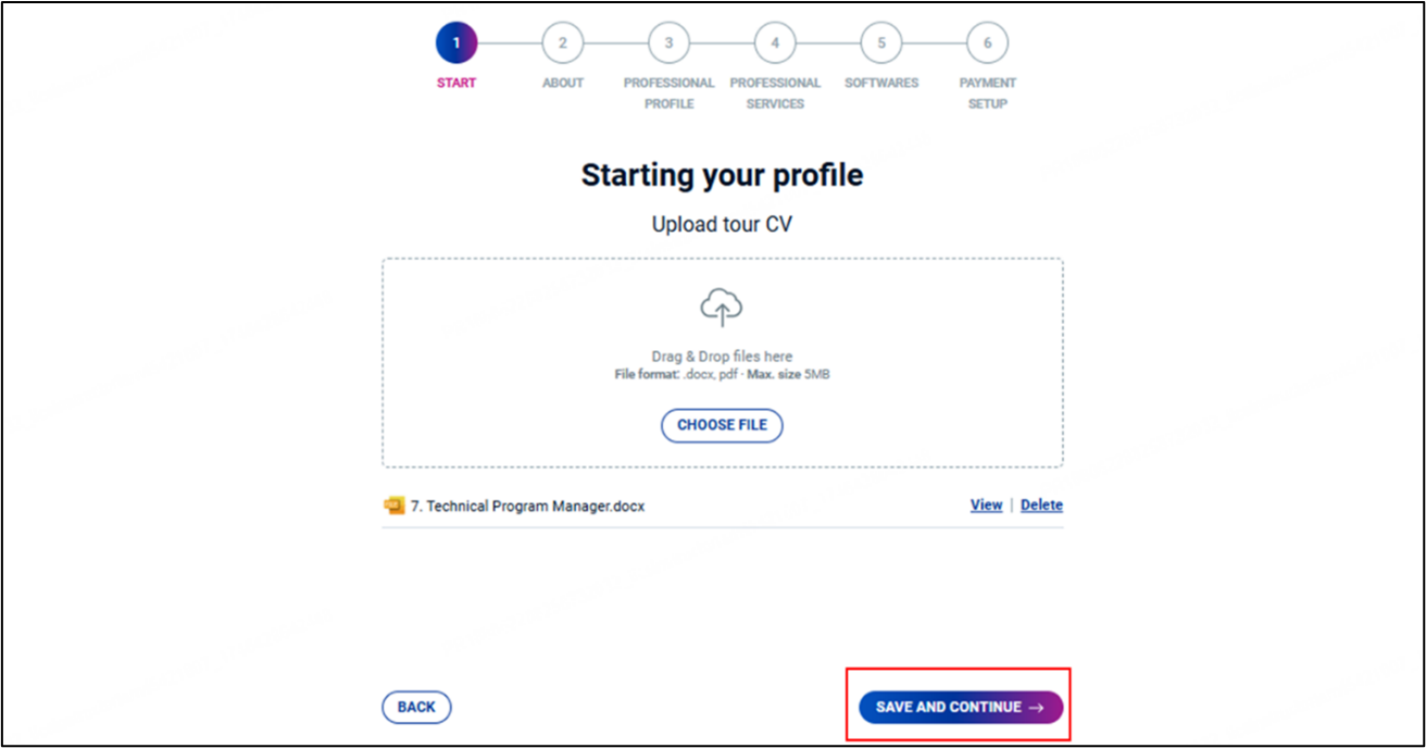- You can either drag and drop your CV file into the designated area or click Choose File to upload .docx or .pdf file from your device.