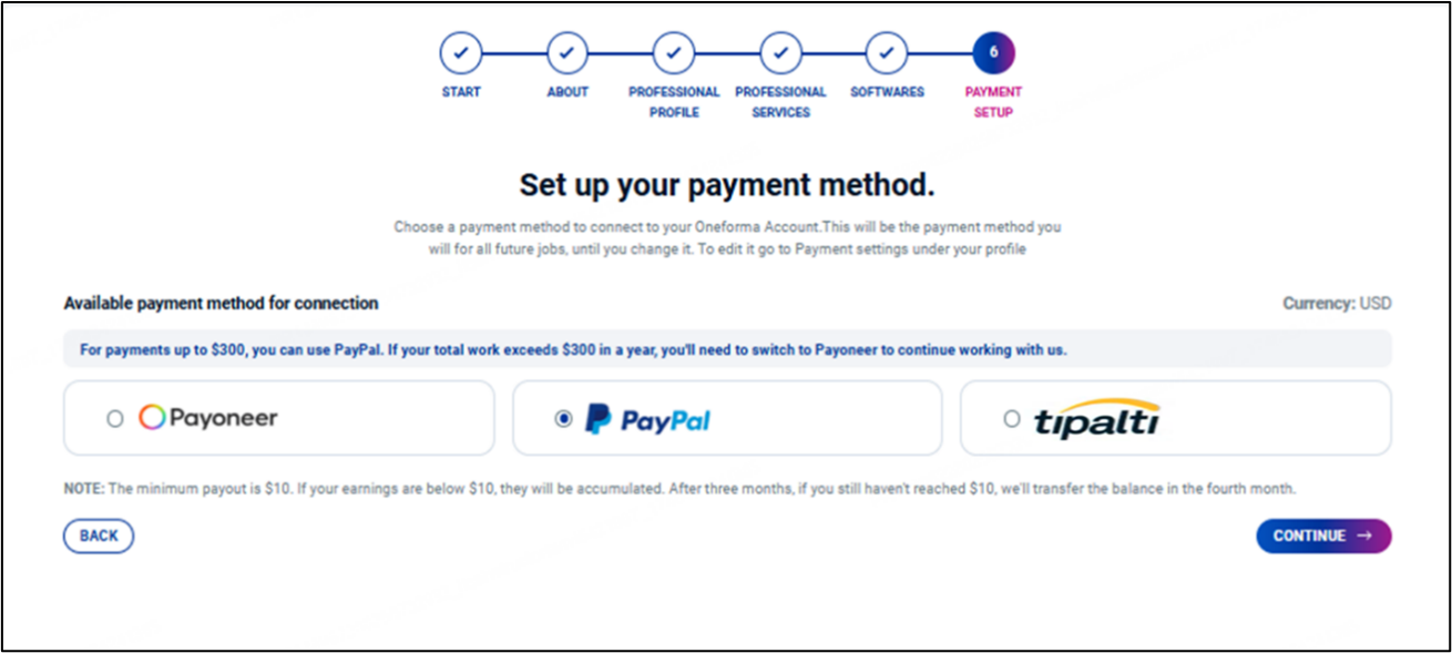 However, the tax forms you submitted must still be approved by OneForma. For certain payment methods, the account cannot be connected until all required verifications are completed. In other words, it will not be considered a payable account. Payments will not be processed for accounts that have not completed all verification requirements.