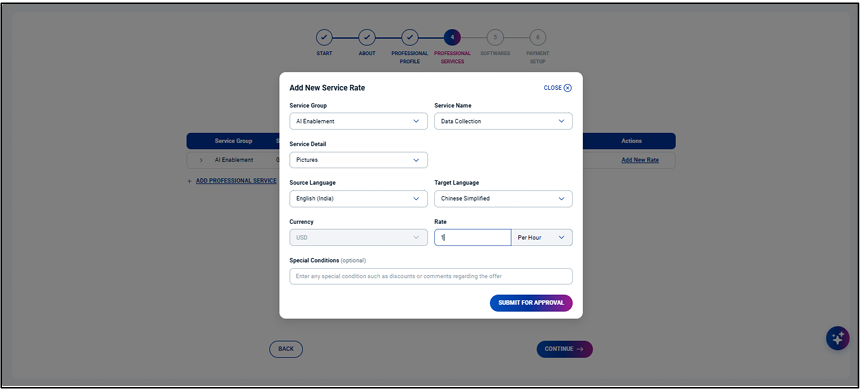 You can enter your language proficiency, add services and the associated service rates.