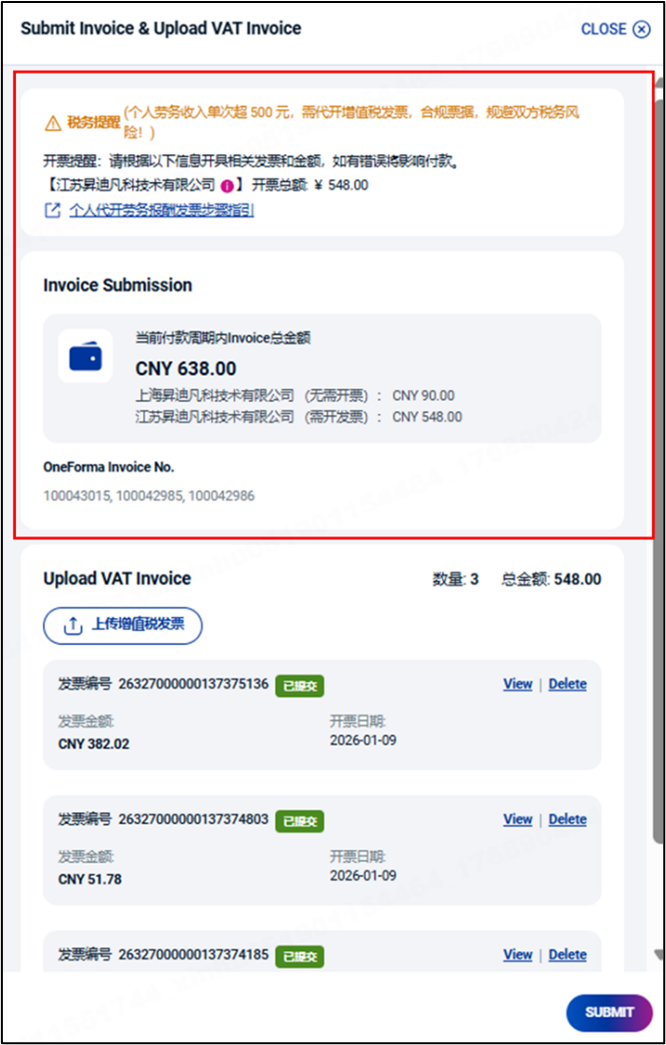 Note: If the invoice amount is ¥500 RMB or less, VAT invoice submission is not required.