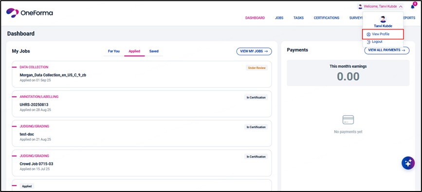 Log in to OneForma using your email and password, then navigate to Profile and click “View Profile”.