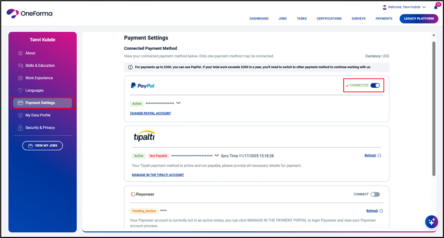Payoneer is one of the available payment options for OneForma users. If you work on UHRS jobs, Payoneer must be set as your default payment method. You can configure your payment setup anytime from your Profile section, but it must be completed before you begin any production work.